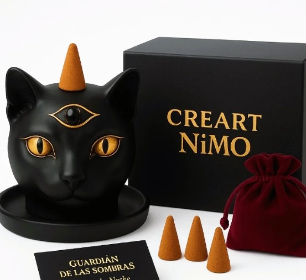 Su forma felina simboliza la vigilancia espiritual, la agudeza intuitiva y la conexión con lo invisible. El Tercer Ojo del Guardián está consagrado con Obsidiana Negra, una piedra ancestral conocida por: